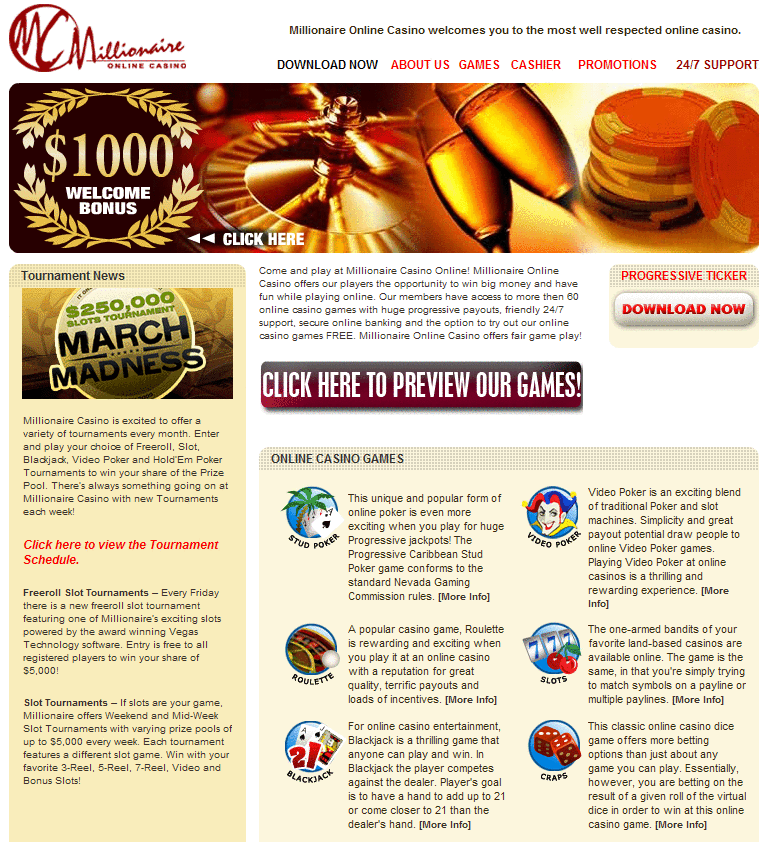 Other Games: Millionaire Casino has over 100 games including all types of slot games, card and tables games, high paying video poker games and a full suite of progressives.